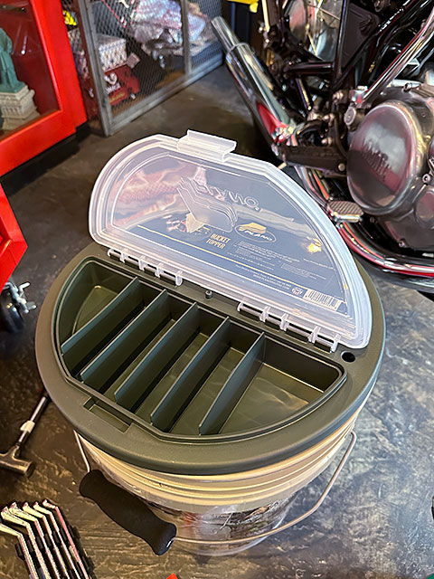 バケツに装着できるパーツストッカー、「バケットリッドストレージ」です。