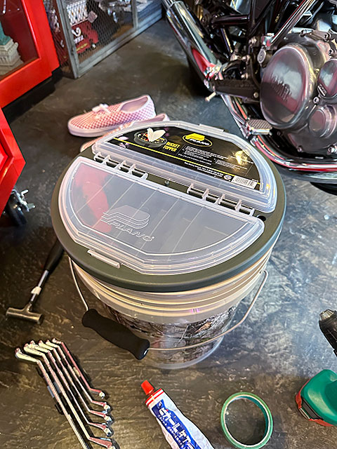 自宅ガレージではいつもの道具箱に収納しておいて、いざ作業する時には、そこから必要な道具だけをバケツに入れて持って出掛ければ、使い勝手はもはや最強です。