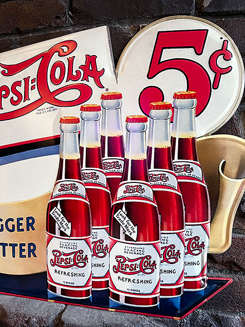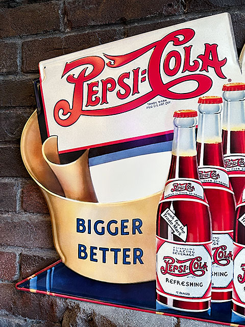 その昔、ソーダファウンテンやジェネラルストアの軒先を飾ったペプシの看板を復刻した人気のエンボスティンサインです。