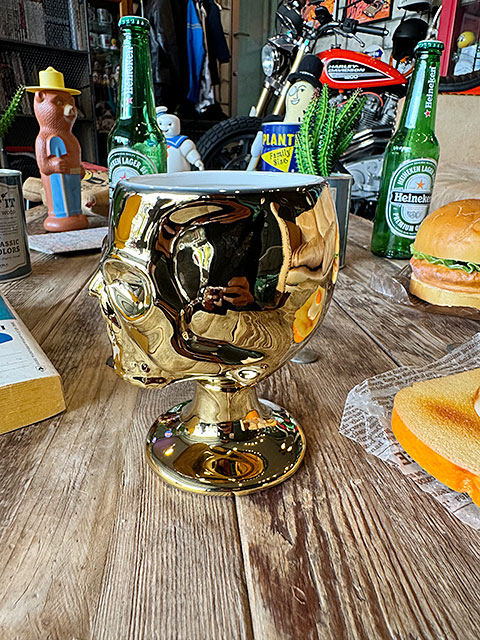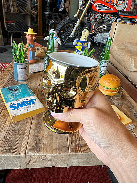 黄金のガイコツを型取った金銀財宝風のワインタンブラーです。