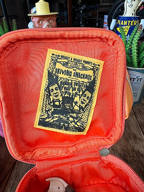 オレンジ色した四角いパッケージボックスをそのまま再現してあって、ファスナーを開けるとこのスナックを開発したフレッドとジョージの傑作ラベルが付いてるの!