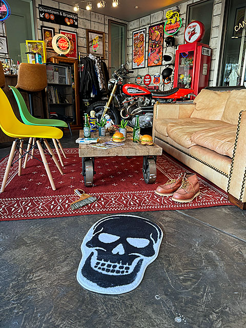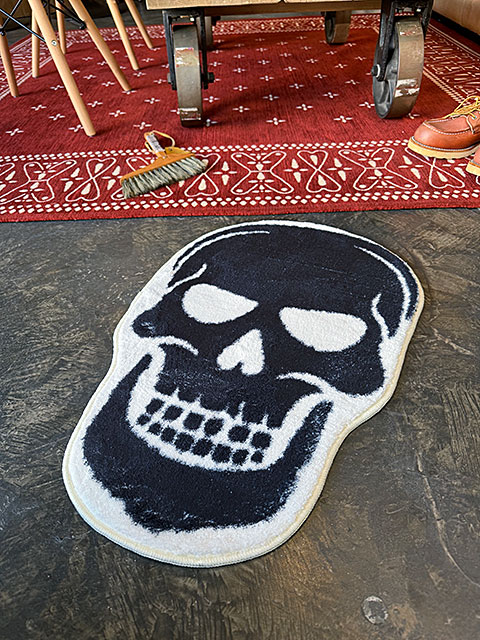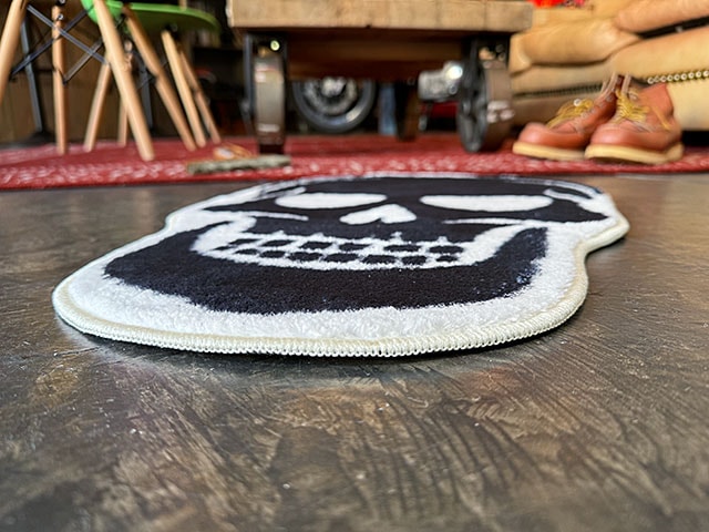 カスタムアートやミリタリーの世界でよく目にする「スカル」をデザインした不気味さ漂うルームマットです。