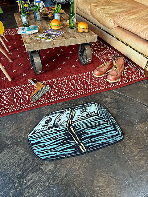 映画や海外ドラマで、裏取引をするシーンでよく登場する輪ゴムでドサッと束ねた100ドル紙幣をモチーフにした、アンダーグラウンドデザインのルームマットです。