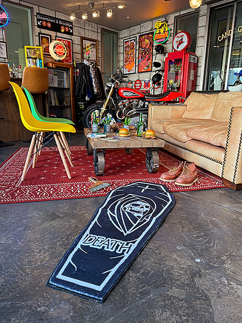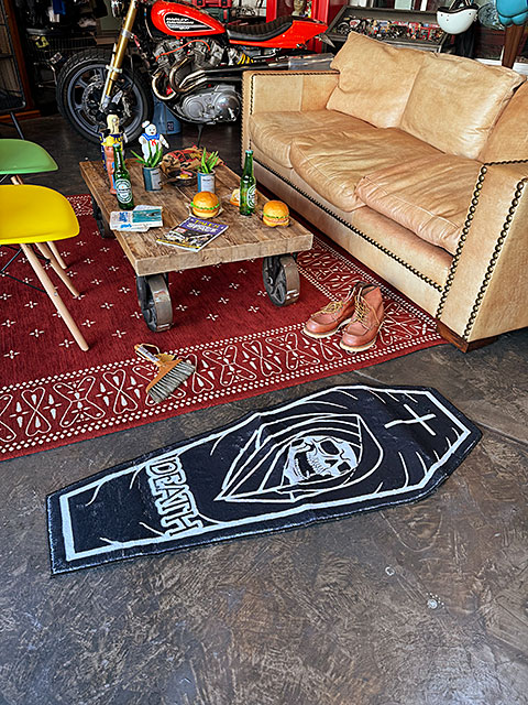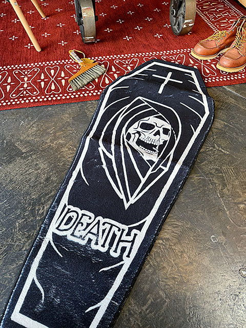 カスタムアートやミリタリーの世界でよく目にする「リーパー」(死神)と、「コッフィン」(棺桶)をデザインした不気味さ漂うルームマットです。