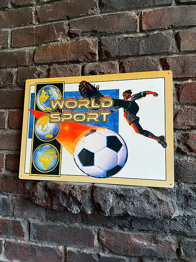 世界中が熱狂するスポーツ、サッカーを題材にした看板がついに登場しました! 躍動感あふれるシュートシーンと弾丸のように突き抜けるサッカーボールがデザインされています。 看板の横にはワールドスポーツにふさわしく世界を表す地球のシンボルマークが入っています。 熱狂的なサッカーファンのお部屋を演出するアイテムがこれで一つ増えましたね!(≧∀≦)/ サイズ:縦30cm×横42cm(約) MADE IN U.S.A.