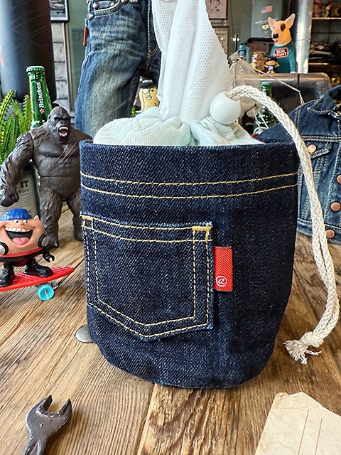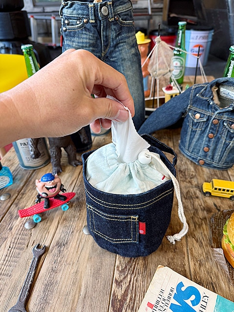 岡山産のデニム生地を使って、熟練デニム職人さんが1点1点、真心込めて仕上げたこだわりのロールティッシュケースです。
