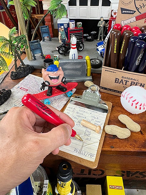 ペン先は0.8mmの油性の黒なので、使い勝手も普通のボールペンと変わらず、バットの厚みが程よいグリップ感を生みだして、握り心地もイイんです。