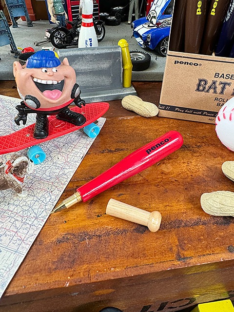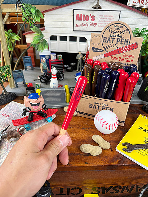 味わいのある木製の野球バットのミニチュアかと思いきや、グリップ部分を回転させるとキャップが外れて、ボールペンになるというアイテム!