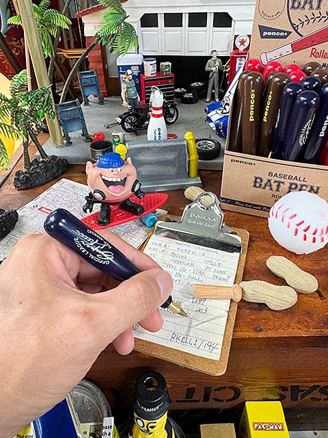 ペン先は0.8mmの油性の黒なので、使い勝手も普通のボールペンと変わらず、バットの厚みが程よいグリップ感を生みだして、握り心地もイイんです。