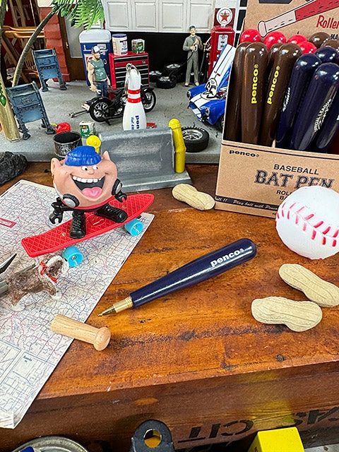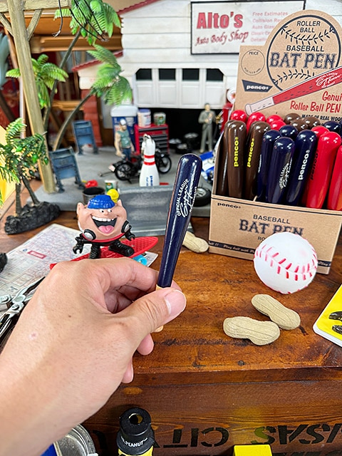 味わいのある木製の野球バットのミニチュアかと思いきや、グリップ部分を回転させるとキャップが外れて、ボールペンになるというアイテム!