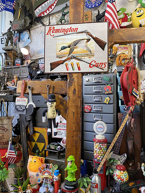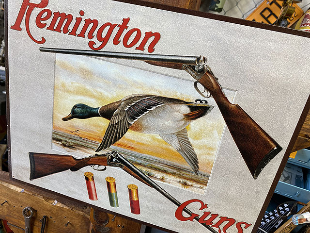 アメリカの銃メーカー・レミントン社のショットガンの宣伝看板です。 雄大なアメリカ大陸を羽ばたくカモが描かれ、その上下にはレミントン社のハンティング銃がデザインされています。 弾を装てんする状態で二つに折れ曲がっているスタイルをさりげにデザインアクセントしちゃってるところが憎いですよね! この看板でアメリカの大自然を気持ちよく感じて下さい。 サイズ:横40.5cm×縦32cm(約) MADE IN U.S.A. 材質:ブリキ