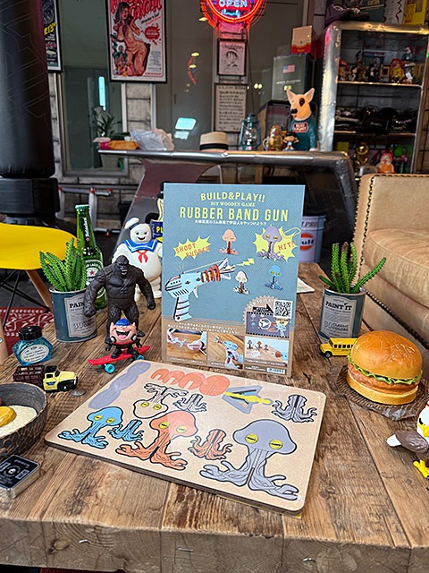 自分で組み立てた光線銃型の輪ゴム鉄砲で、エイリアンたちをやっつける!