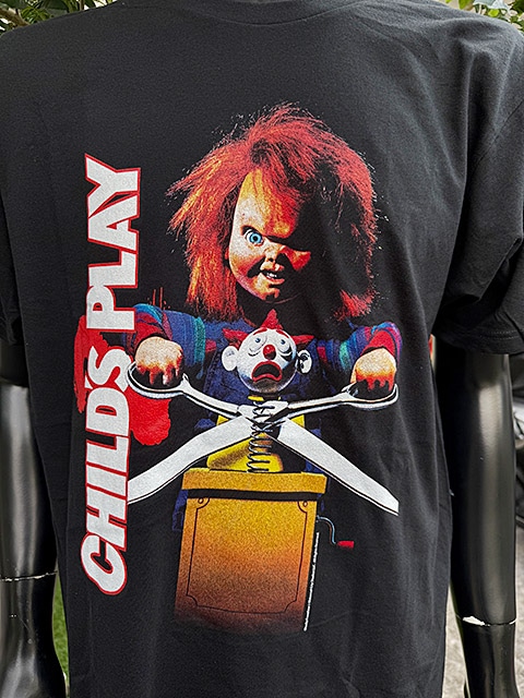 びっくり箱から飛び出してきたピエロを巨大なハサミでちょん切ろうとするチャッキーが、大きくプリントされた変態T