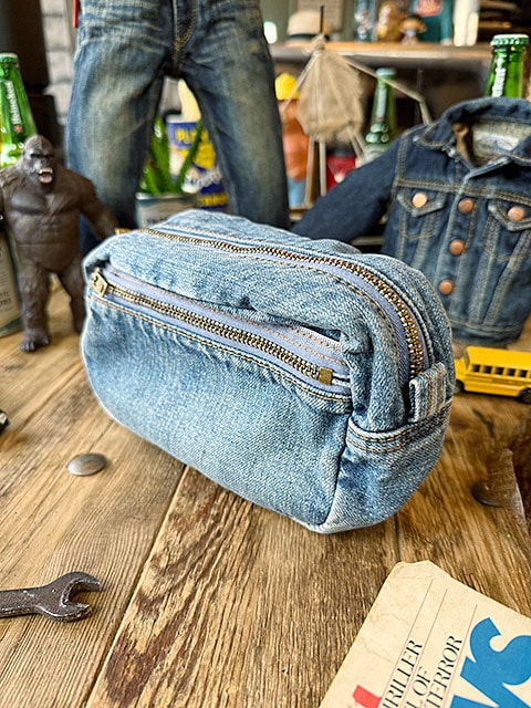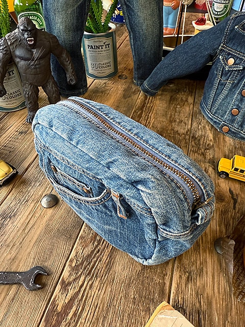 生地から仕立てたポーチが完成したら、今度はお得意のウォッシュ加工を1点1点、丁寧に施していき、最終的にこの魅力的なUSEDデニム風へとなります。