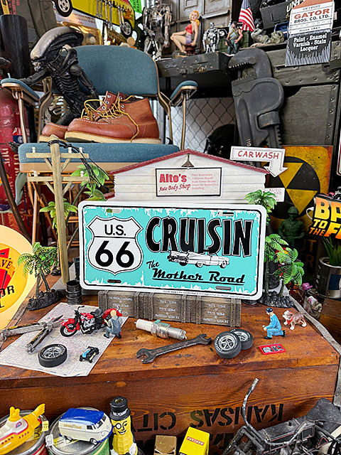 アメリカの伝説のハイウェイ、「ルート66」をテーマにしたオールドアメリカ好きのためのライセンスプレートです。