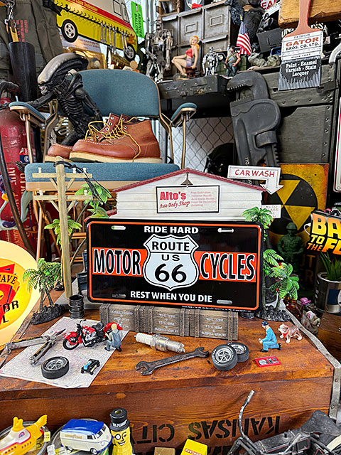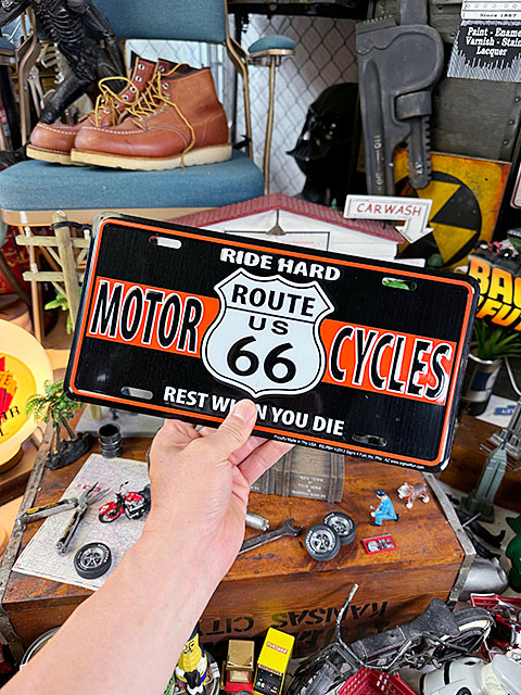 アメリカの伝説のハイウェイ、「ルート66」をテーマにしたオールドアメリカ好きのためのライセンスプレートです。