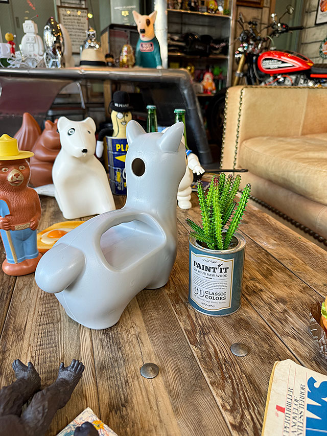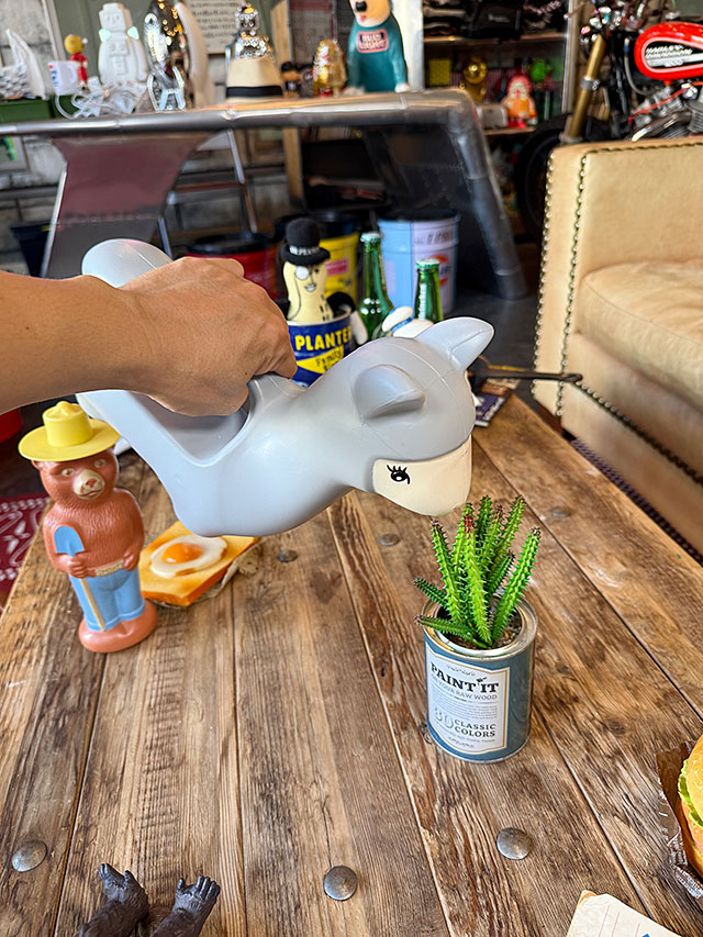背中のハンドルを持って、傾けると口からお水がチョロチョロと出てきて、いやー可愛いや、楽しいや!