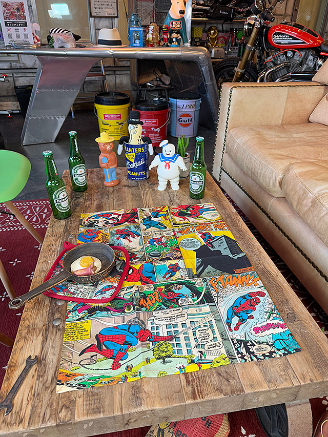 スパイダーマンのコミック本アートを、まるまるデザインに落とし込んだテーブルクロス&ポットホルダーの2点セットです。