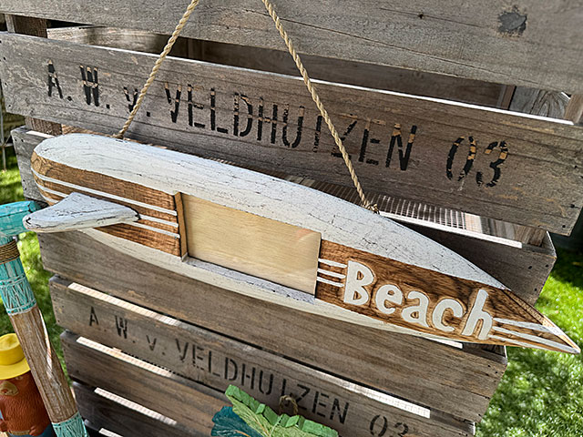 昔のヴィンテージサーフボードを思わせるウッディなボードを型取ったハンギングタイプのフォトフレームです。