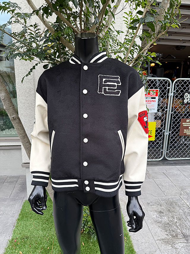 ジャケットの素材はポリエステルとレーヨンを使ってウール風生地を再現し、そで部分には合皮を使ってスタジャンのベーシックなスタイルをしっかりと再現してあります。
