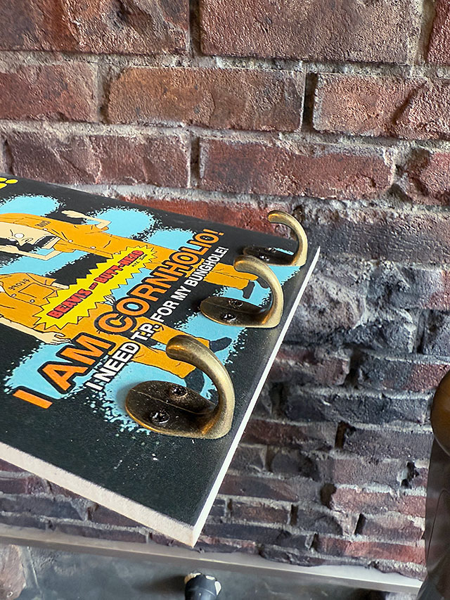カギや帽子、バッグなどをいつもの定位置にキープしてくれる便利なフックボードを、昔のレトロコミックの表紙デザインで仕上げたっていう、とびきりアメリカンなヤツ!