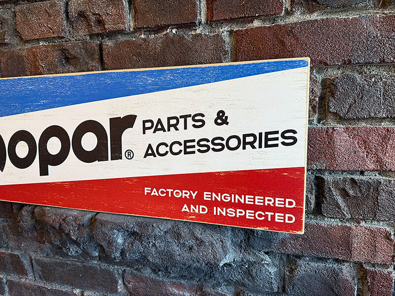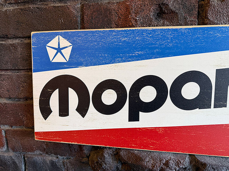 モパーの純正カスタムパーツを扱うオートショップが掲げてるディーラーサインを再現したウッドボードです。