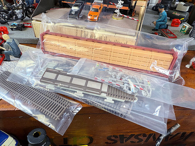 ジオラマは踏切り部分だけかと思いきや、前後に線路が延び、貨物の荷台車両までも再現されてるので、メッチャリアルなシーンが完成します。