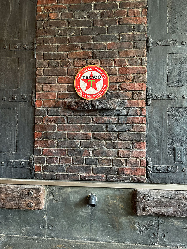 テキサコのTの文字に星のマークが合わさった、昔ながらロゴマークが大きくデザインされた看板で、ガスポンプの先端のガスライトにも採用されてるデザイン!