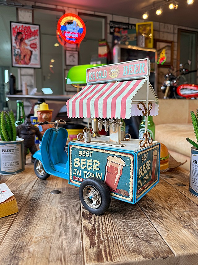 イベントとかで目にする移動販売式のビールスタンドを、なんとブリキオブジェで再現したっていう・・・・