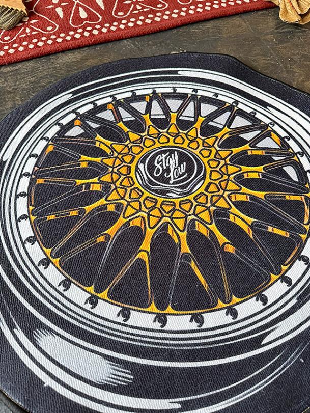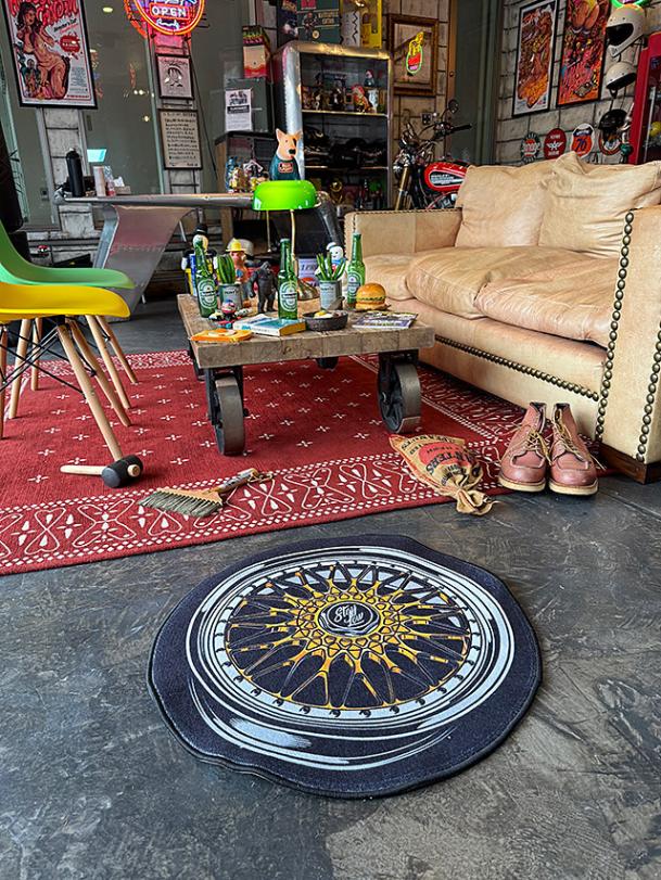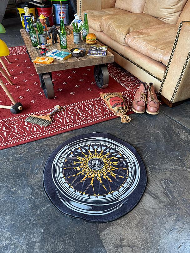 部屋の中にいながらにして、そんな男の憧れのシーンを感じていようと見つけたのが、このホイール型ルームマットです。