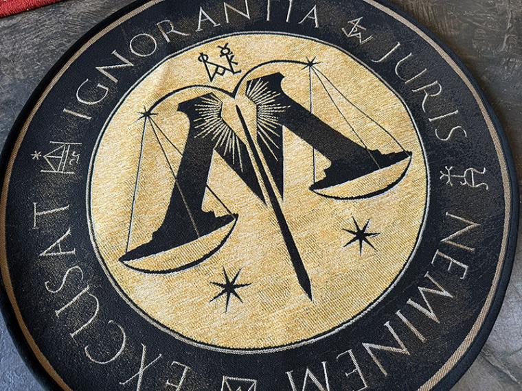 ハリーポッターに登場する魔法界の政府機関、魔法省のエンブレムをゴブラン織りでデザインした60cmサイズのルームマットです。