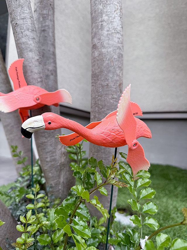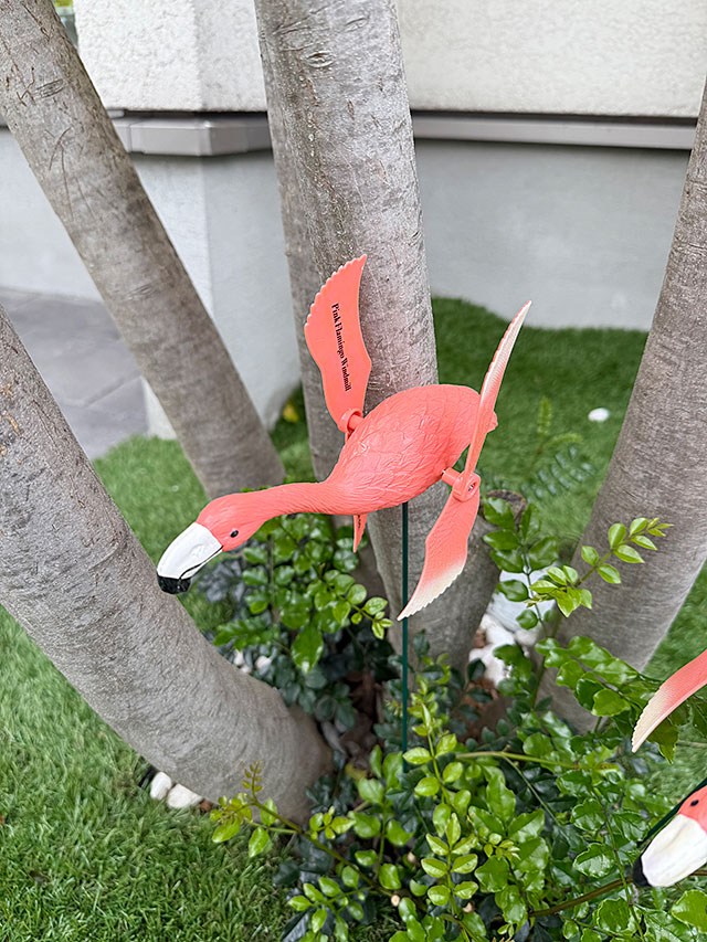 涼しげな南国のフラミンゴが庭先でお出迎え!