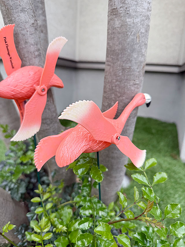 風を受けると羽が回転し、フラミンゴが羽ばたいているようにみえるの!