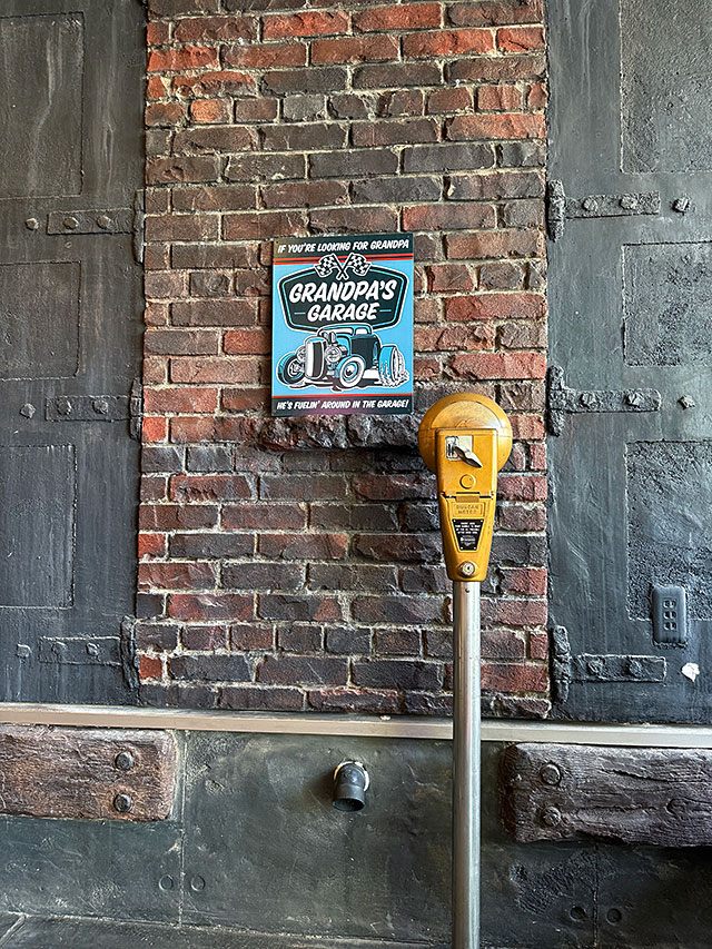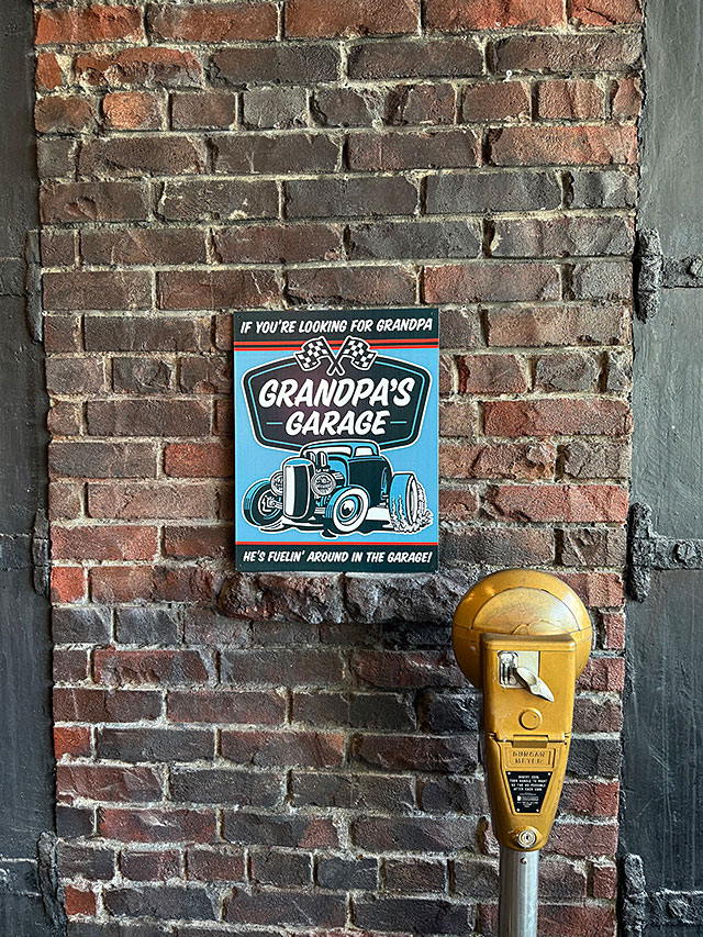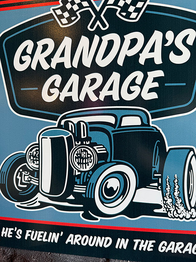 カッコイイ旧車のアメ車やハーレーなんかを乗り回してる、クールなおじいちゃんのガレージをテーマでデザインされた、アメリカらしい看板がこちら!