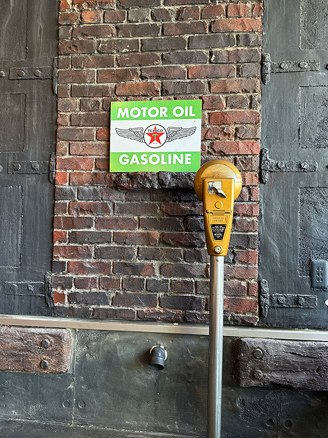 テキサコのTの文字に星のマークが合わさった、昔ながらロゴマークが大きくデザインされた看板で、ガスポンプの先端のガスライトにも採用されてるデザイン!
