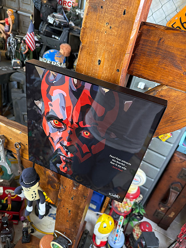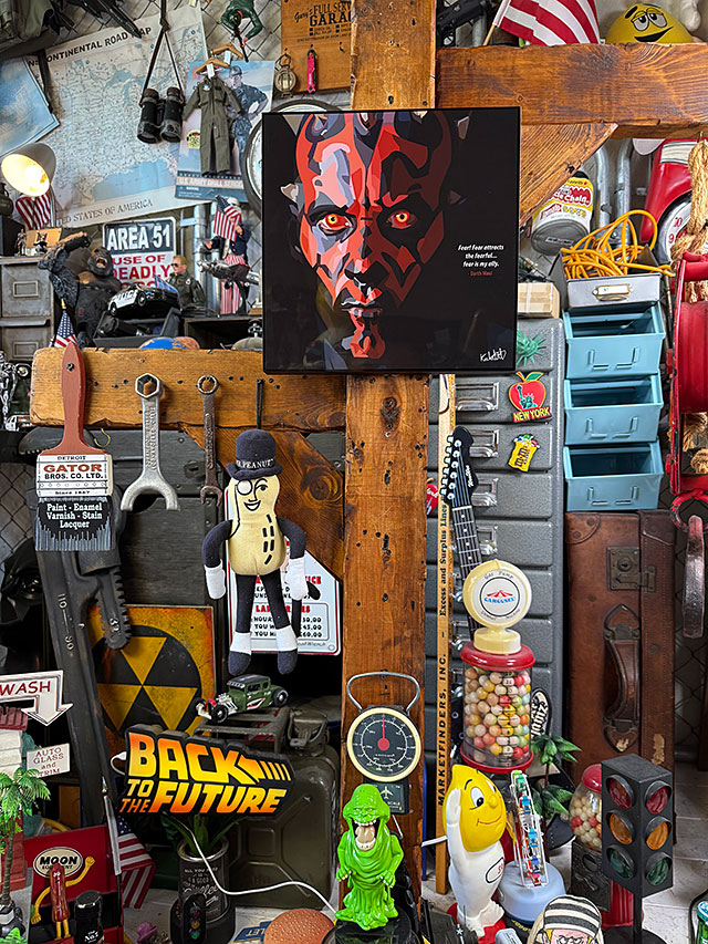 単なる写真デザインだと、いわゆるスターウォーズグッズのコレクションってくくりに見えちゃうけど、さすがアーティストだけあって、壁面を演出するアートとして成立させちゃう見せ方が絶妙なんです。