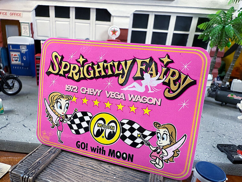 1972年式シボレー ベガワゴンをド派手なピンクに塗って、妖精キャラをテーマにカスタムペイントした、可愛すぎるムーンアイズのオフィシャルドラッグマシンのステッカーです。