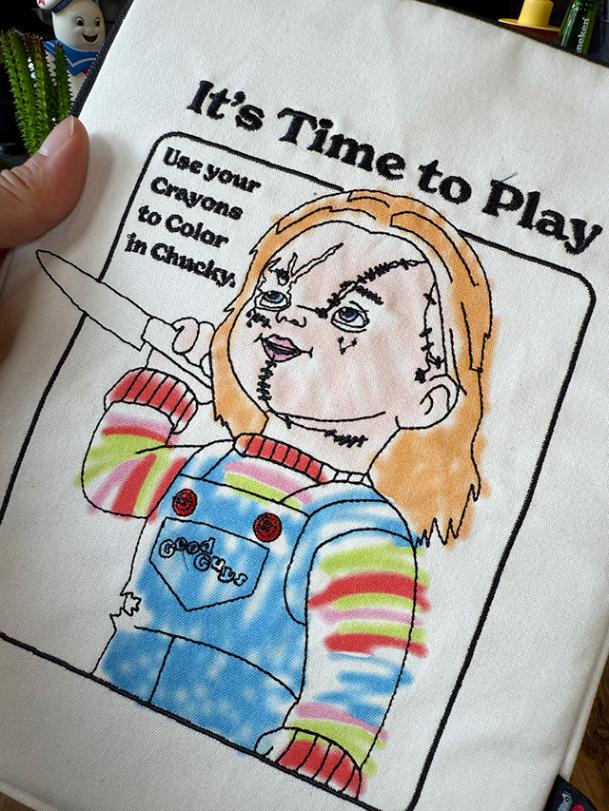 ナイフを手にしたキズだらけのチャッキー様が、全面にデザインされた危ないタブレットケース。