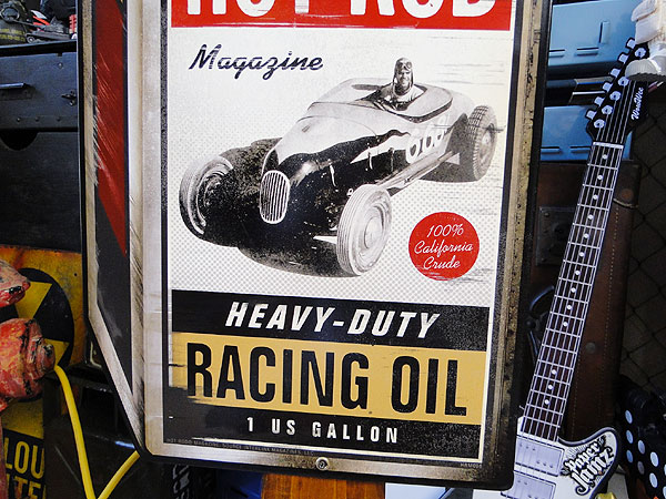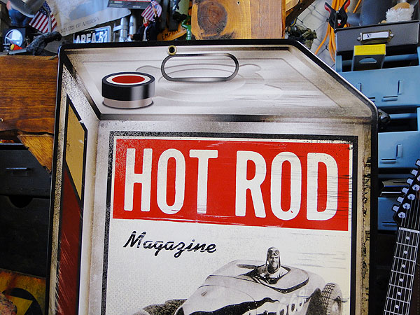 アメリカのカスタムショップに足を運ぶと目にしそうなホットロッド系デザインのオイル缶の形をしたヘヴィースチールサインです。