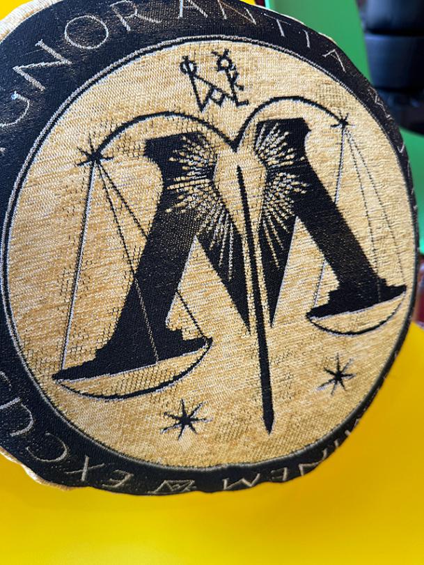 ハリーポッターに登場する魔法界の政府機関、魔法省のエンブレムをゴブラン織りでデザインした35cmサイズのクッションです。