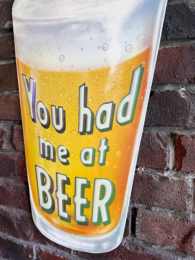 英語のユーモア看板で、「ビールと聞いたら、もう行くしかない!」ってノリの意味!