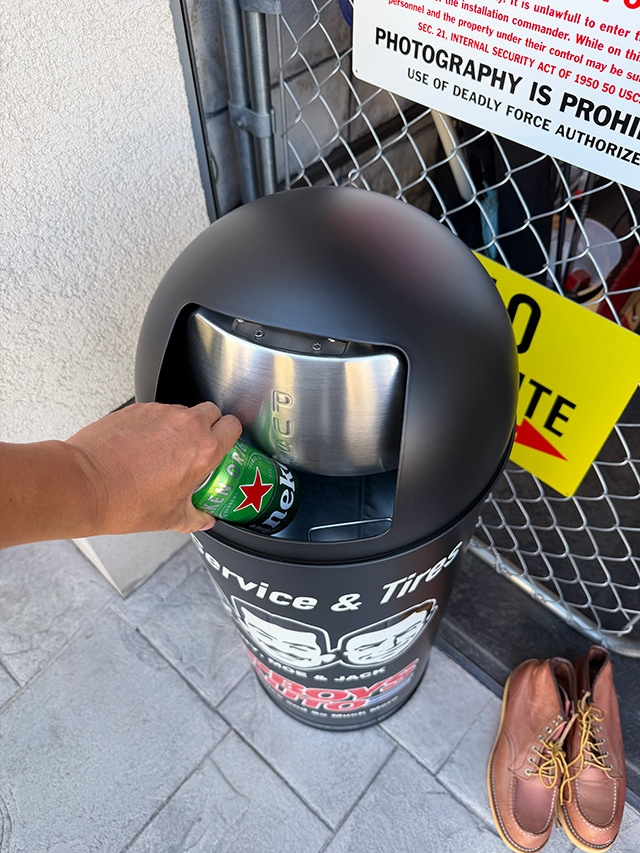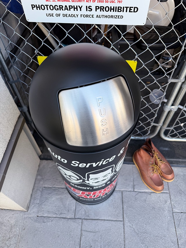 彼らが描かれたこのダストボックスは、まるでアメリカの街角にある「リアルな整備工場の片隅」を切り取ったような存在感でしょ?
