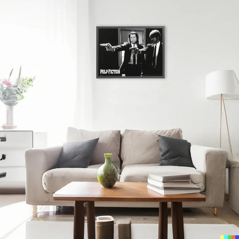 タランティーノの金字塔「パルプフィクション」から、伝説のツインガンシーンを切り取った名ポスターです。