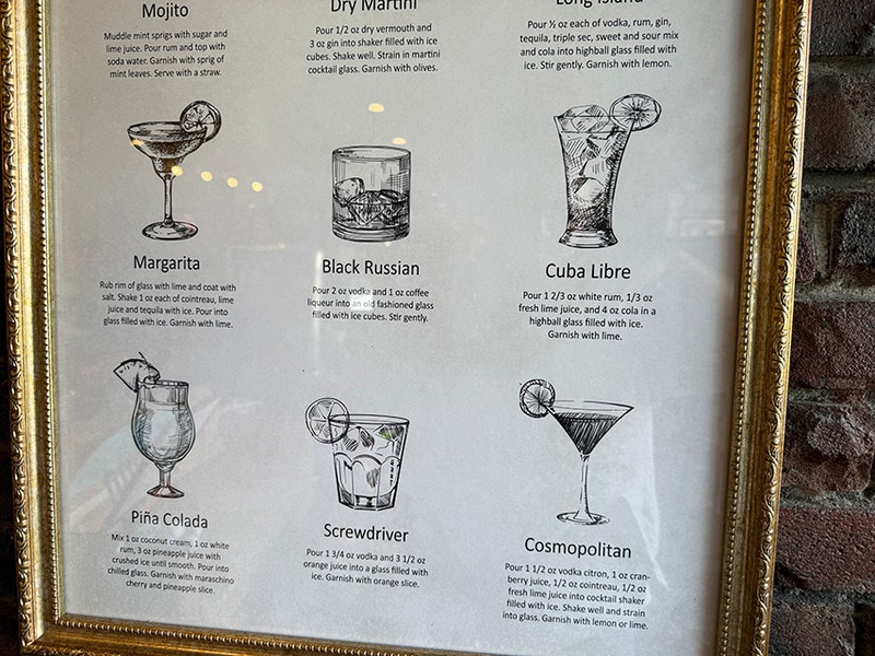 まるで古い洋書を切り取ったような、落ち着いたトーンと手描きの線画で、モヒート、ドライマティーニ、ロングアイランド、マルガリータ、ブラックルシアン・・・・