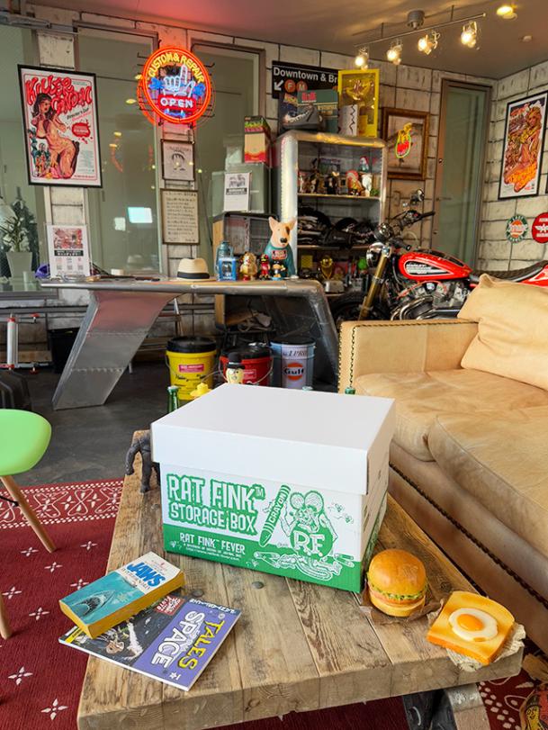 アメリカンガレージを愛する人なら、思わずニヤリとしてしまうこの箱、あのモンスターマウス「ラットフィンク」がデザインされた、ファン垂涎の収納ボックスです。