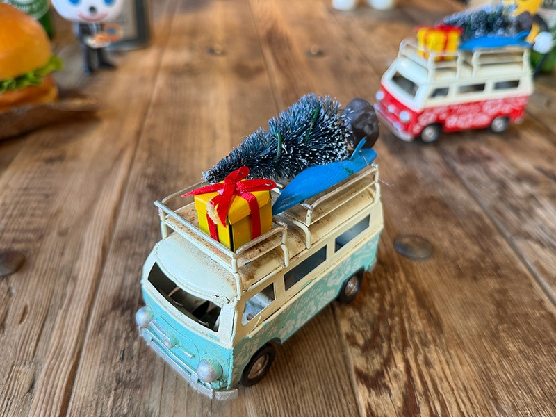 ハワイアン クリスマス ワーゲンバス ミニ ブリキオブジェ (ミントブルー)