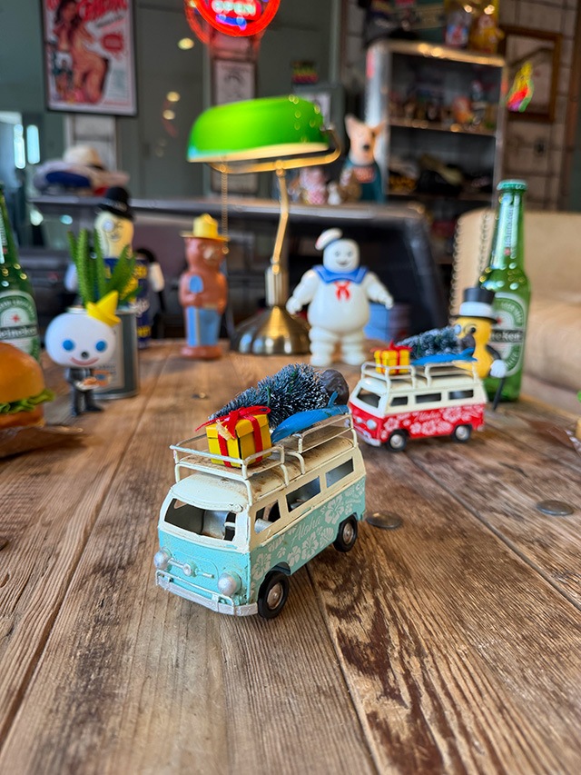 ブリキの質感がたまらない、レトロポップなミニバンオブジェ。