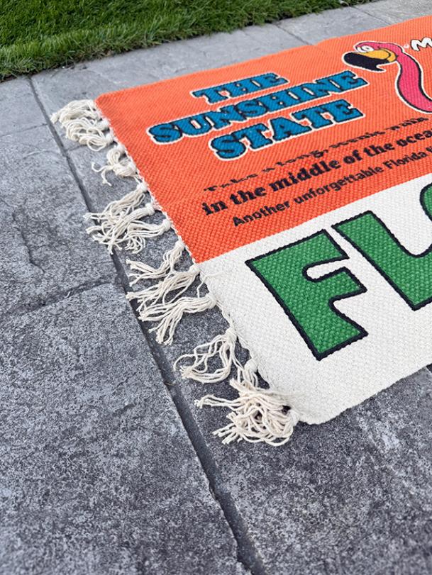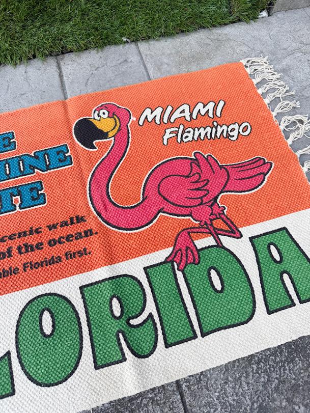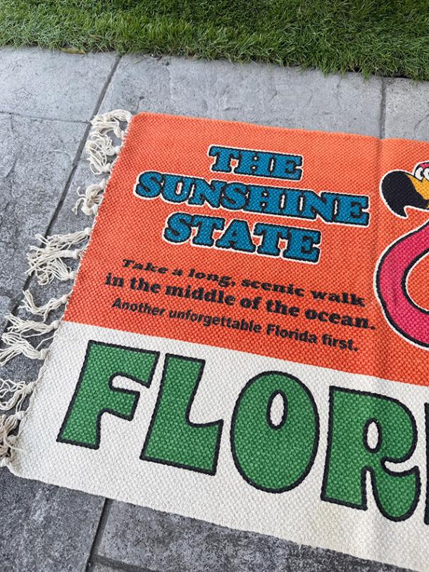 アメリカの旅の途中で立ち寄ったモーテルのロビーや、ビーチサイドの売店に敷かれていそうな、そんなノリのコットンラグです。
