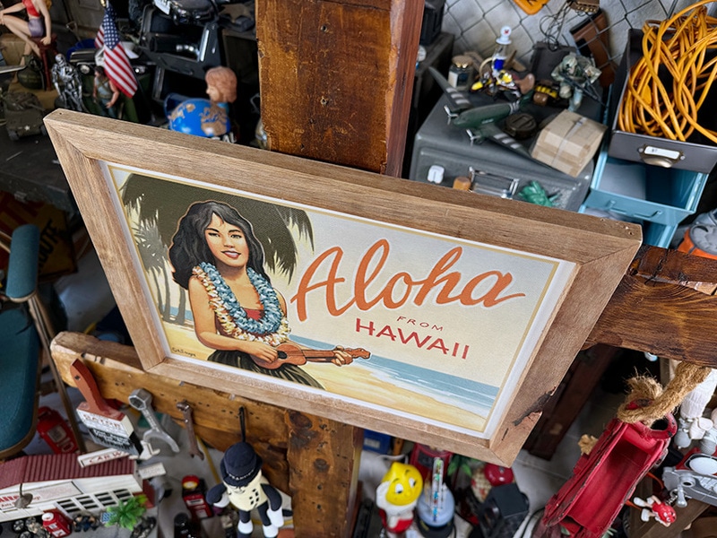 ハワイアン ヴィンテージアート ウッドフレーム (ウクレレガール&ビーチ)