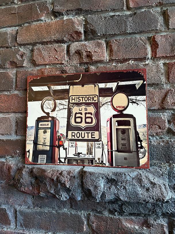 そこに ひとつ掛けるだけで世界観が一気に完成するのが、このルート66ブリキ看板です。